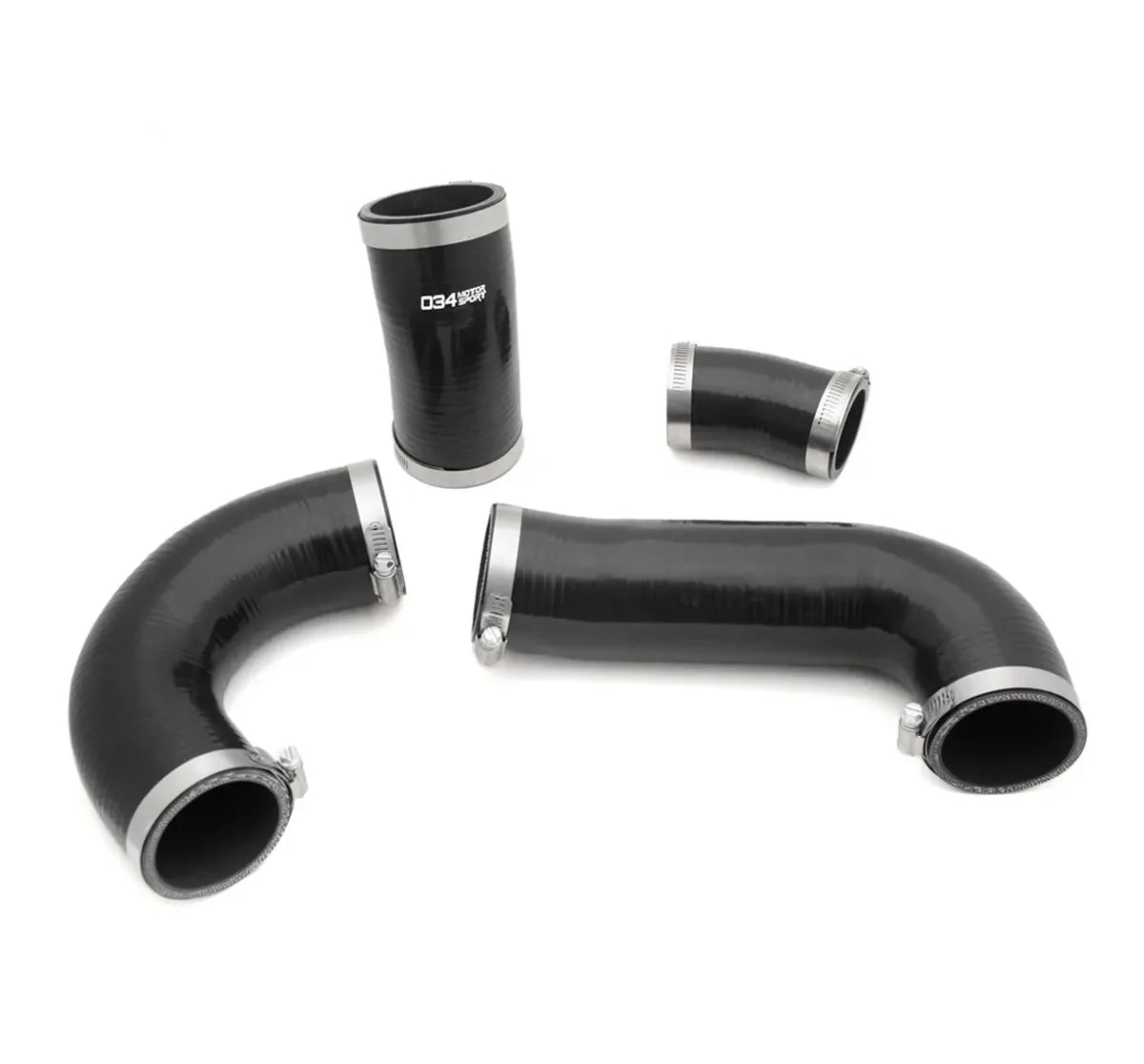 This 4-Piece Reinforced FluoroSilicone Boost Hose Kit for the MkVII Volkswagen GTI & Golf R, 8V Audi A3/S3/TT/TTS 2.0T Gen 3 replaces the factory rubber turbo outlet hose, intercooler inlet/outlet hoses, and throttle body inlet hose.