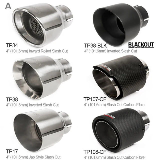 The exhaust is finished with a choice of 4 inch (101.6mm) tailpipe designs, including premium carbon fibre options, allowing you to tailor the look to your build.